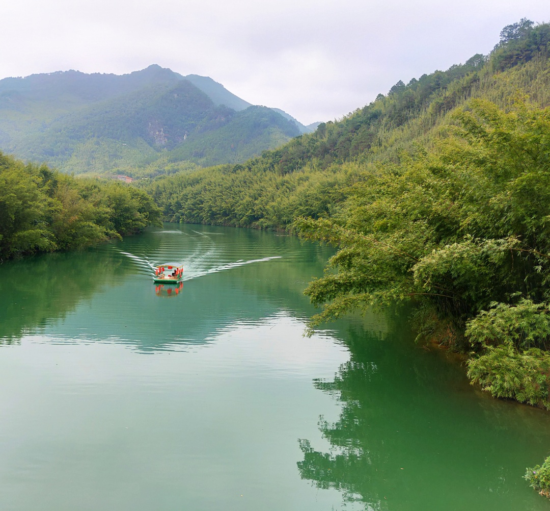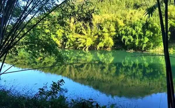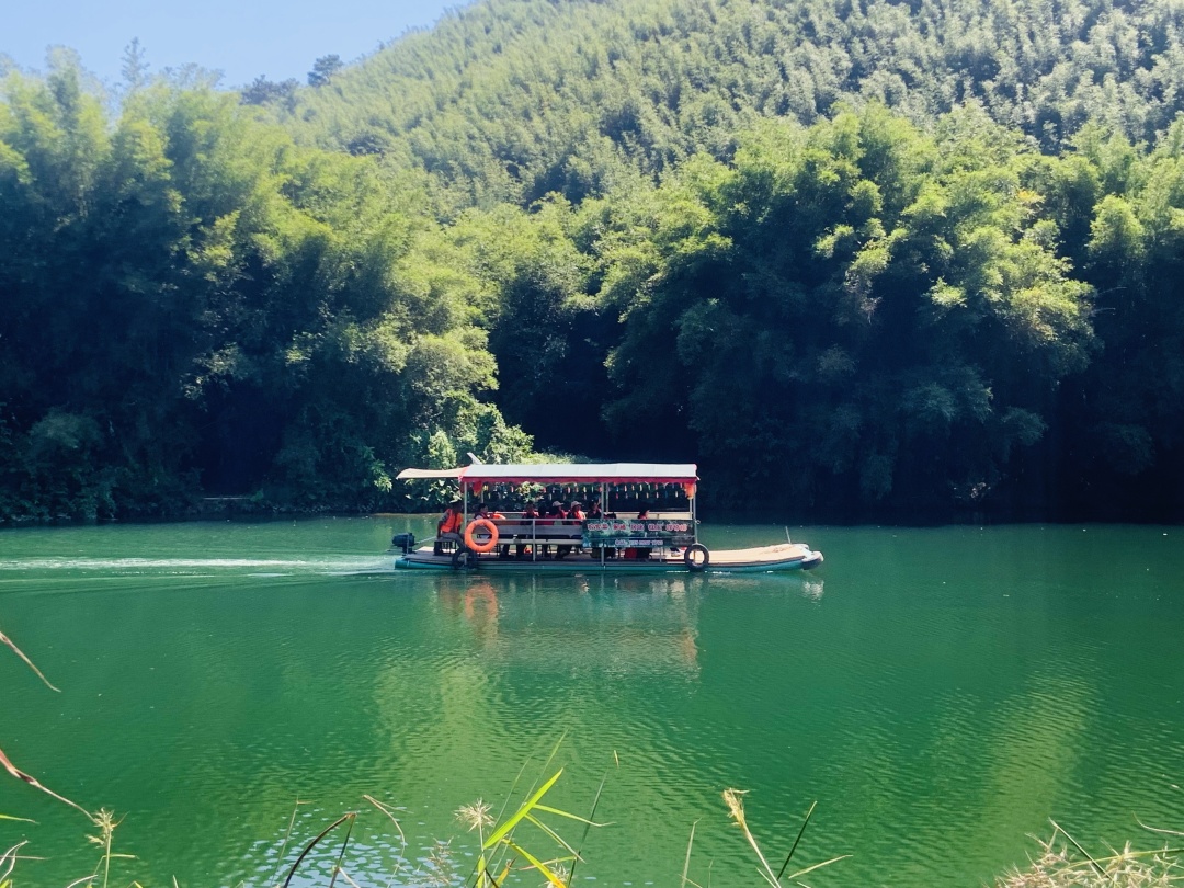 蜿蜒的古水河如一条碧绿的翡翠,镶嵌在山间幽静高远,诗意浓密沿路修竹茂密,河中倒影扑朔迷离,竹筏“乡村振兴号”缓缓在水中游行。
