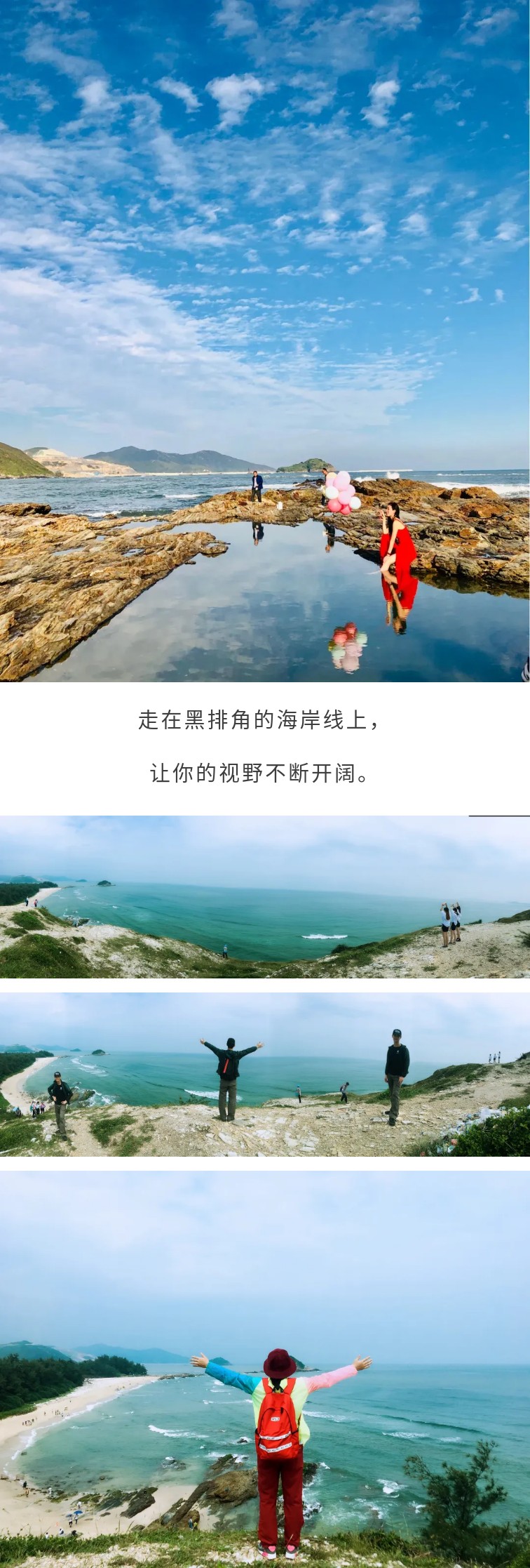 黑排角东靠大洲港,西至双月湾,爬升下降不多。沙滩礁石线路。为初级徒步线路,为广东地区比较合适的入门海边徒步线路。海滨风景宜人,是不可多得的海边徒步线路。