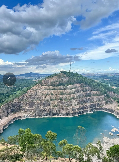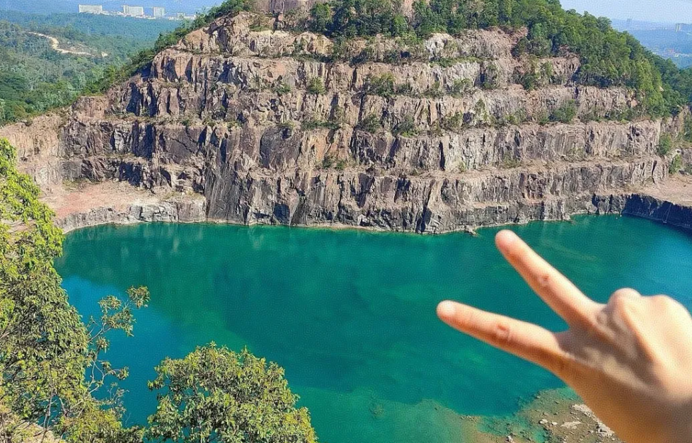 灯笼坑,位于中山市南朗镇灯笼坑村,原是废弃的一个矿坑,经过雨水积累,形成了碧绿如玉的矿坑湖。从山顶俯瞰整个灯笼坑,无滤镜的玻璃水,犹如翡翠爱心湖。