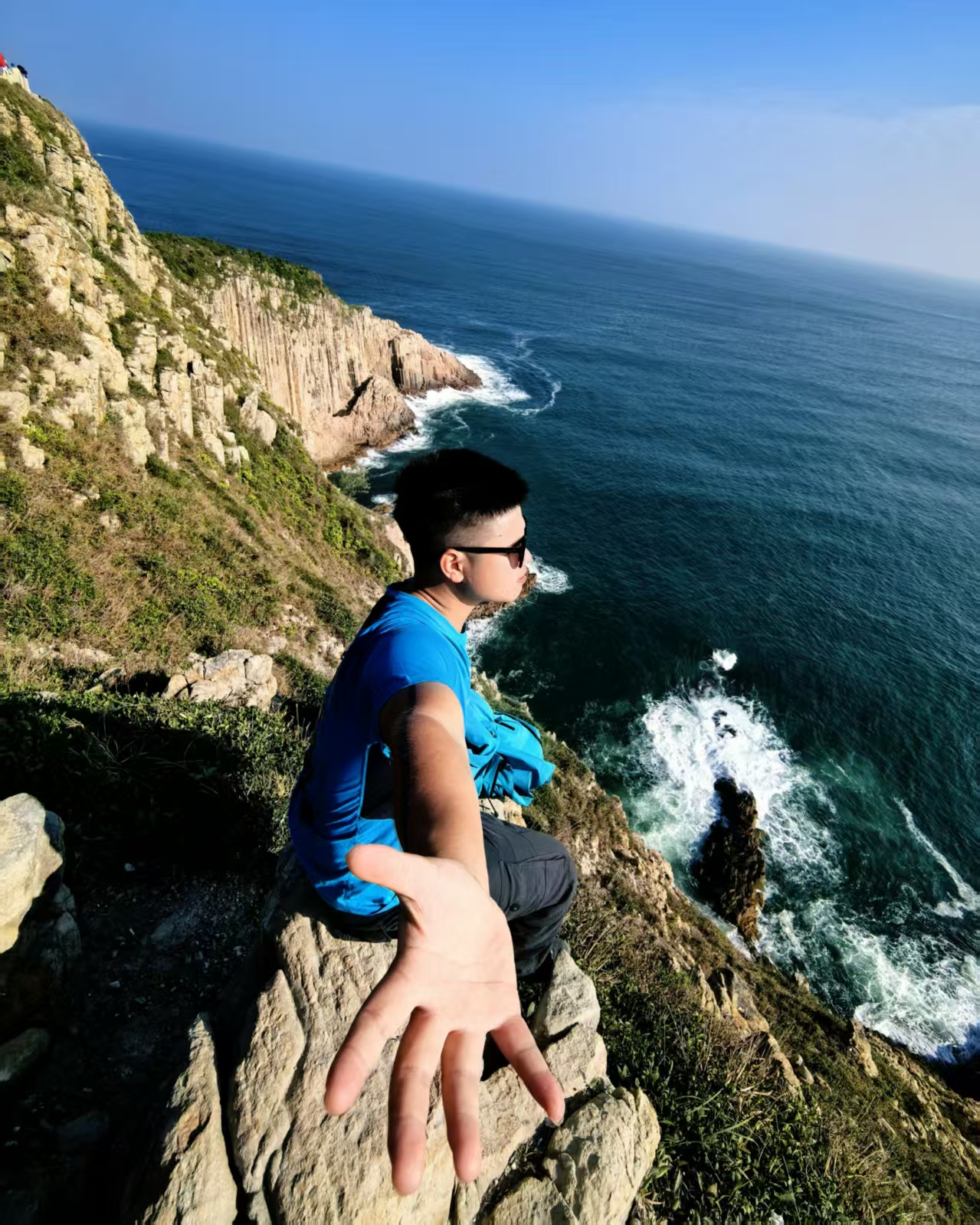 万宜水库东坝,几何感十足的防波堤。汹涌的海水中赫然耸立着一座削去一半的悬崖孤岛一破边洲,以壮观的六角形火山岩柱闻名,是香港世界地质公园代表性景观(也是500元港币背面上的景观哦)