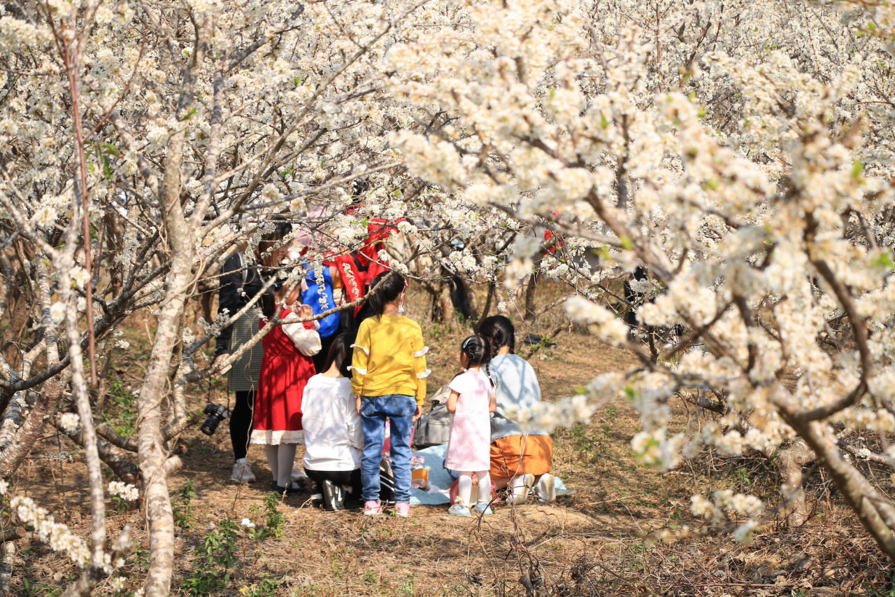 ①新春之际,李花先后争相开放,星星点点,桂峰山脚如同白雪覆盖的仙境