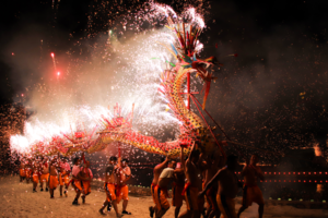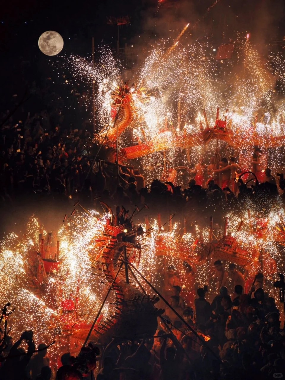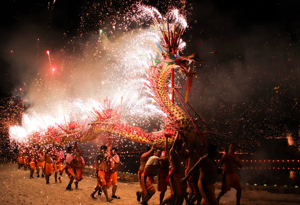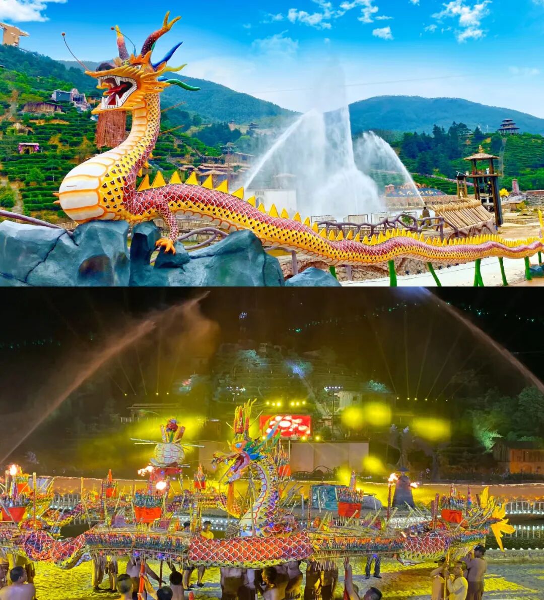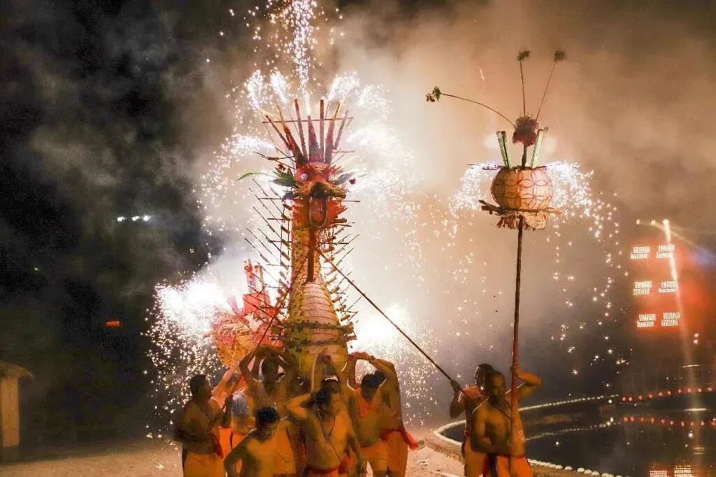 19:00晚餐过后开始欣赏【千年火龙专场表演】《千年火龙》演艺剧目采用水幕全息投影、威亚系统、裸眼 3D 等最新技术,将真人表 演与视频特效进行整体策划创意及对位编排,形成“虚实结合 ”的舞台表现效果,动展现了丰顺的千年火龙文化、千年客潮文化。以及自行参加篝火晚会,观看非遗文化打铁花等。