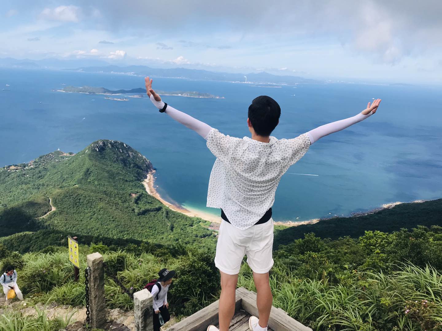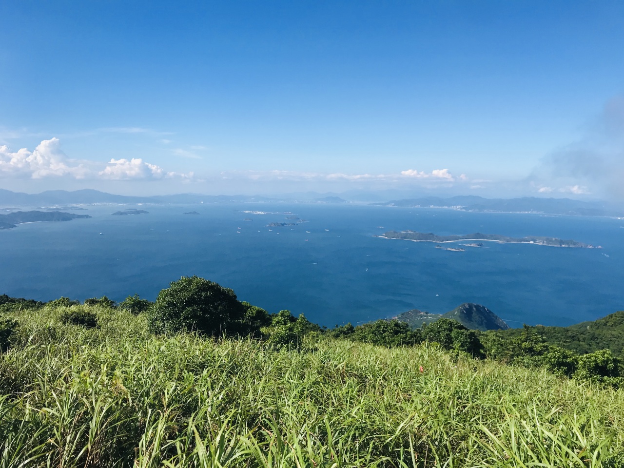 山顶两侧是大海、远处飘浮的小岛、天空的白云