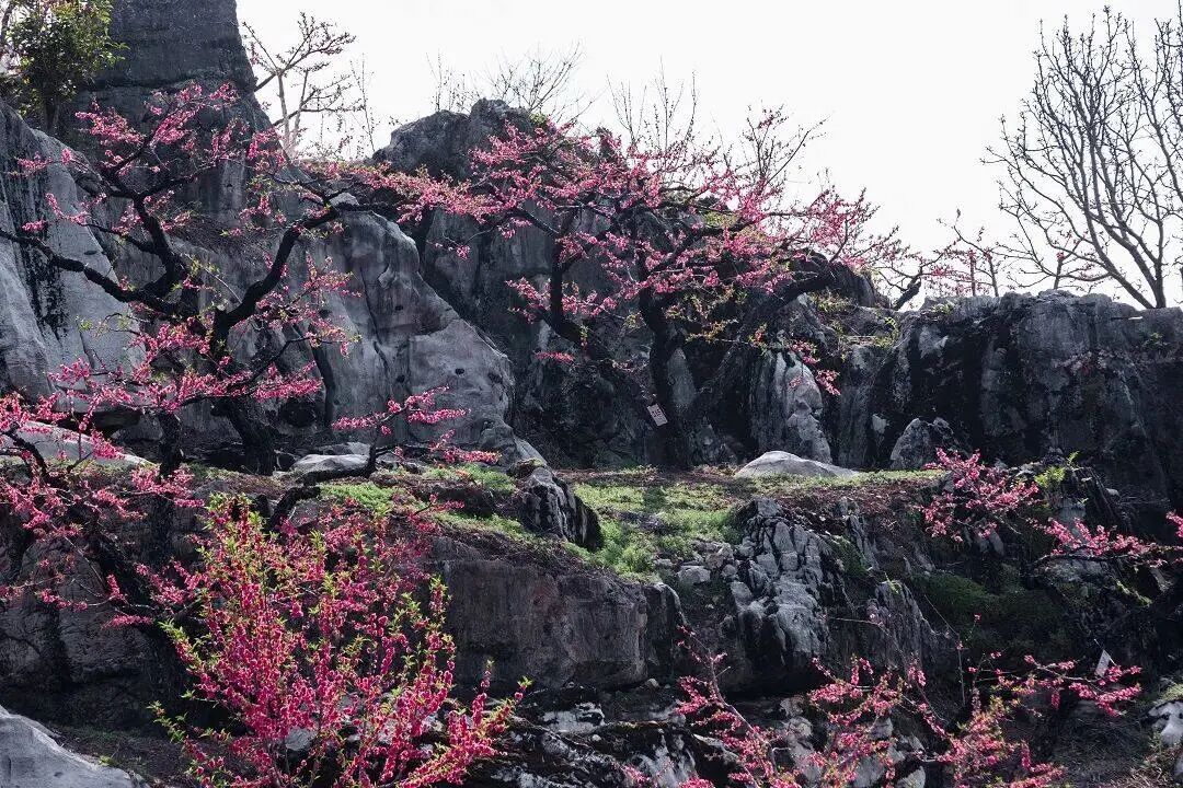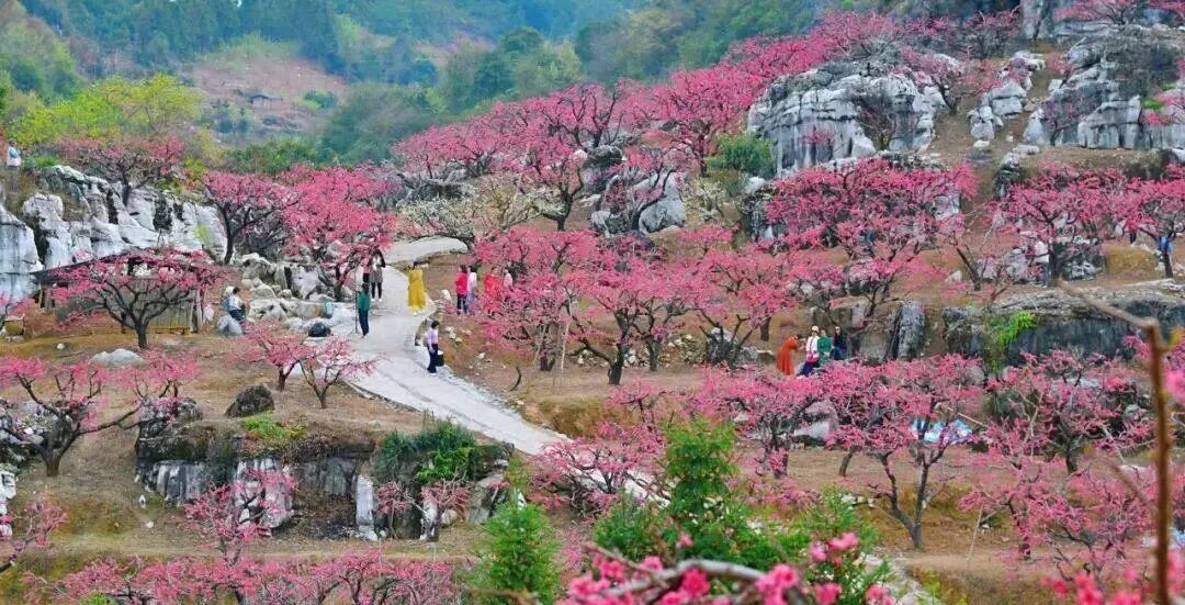 一桃知春,满山桃花,白色山石相衬,如诗如画。