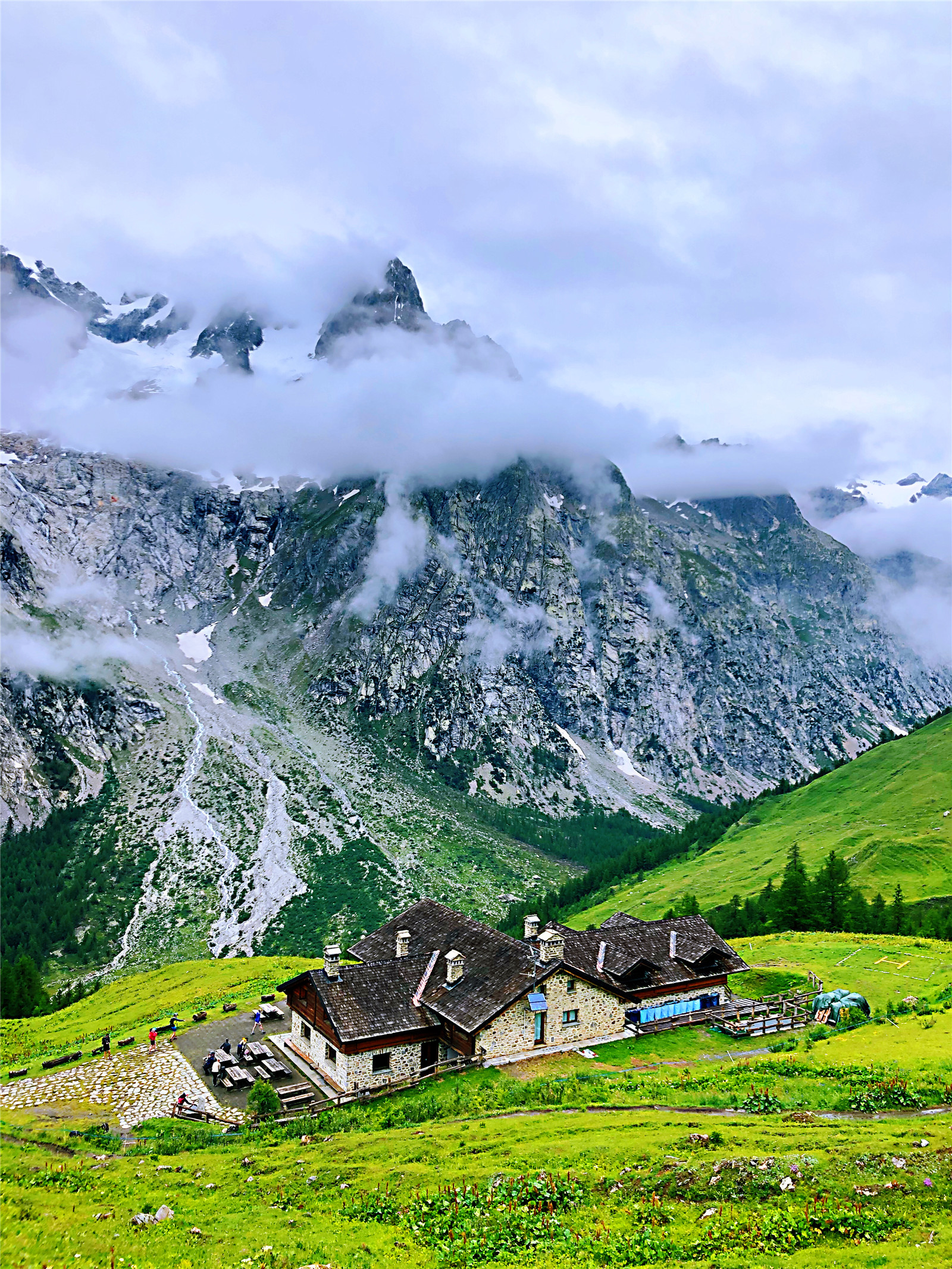 从库马耶出发,我们穿过拉贾小屋(Chalets de la Raja),在博诺旅舍(Bonhomme,2639米)稍作停留,每一个高山小屋,都坐落在让人感叹的绝佳观景点。也许,经过一路以来的行走,我们已经不像前半程对于每一次日照金山的欢呼雀跃,此刻的我们,只是静静的行走,品味着心中慢慢积累和满满溢出的点滴感动。
