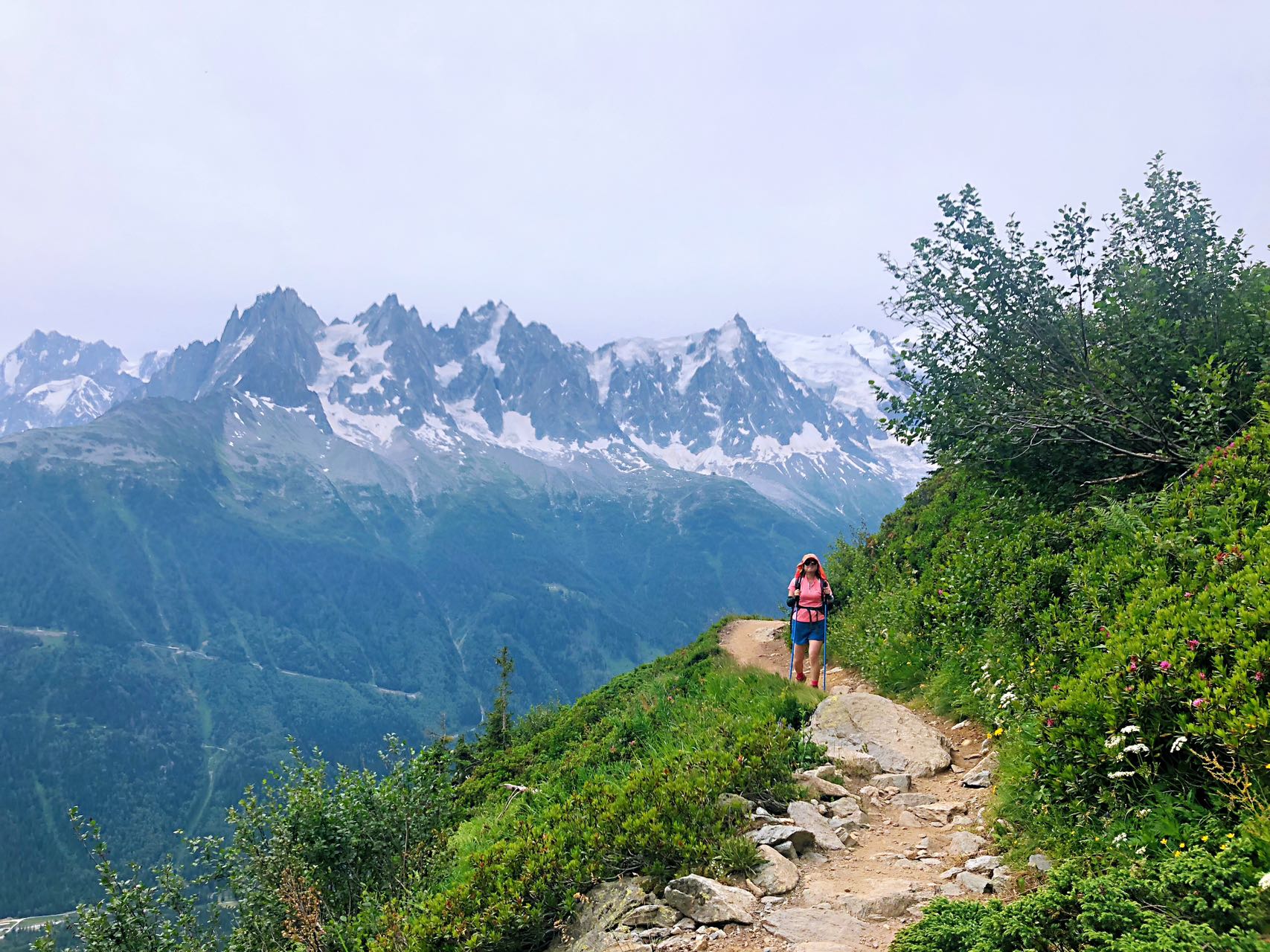早上从Le Tour吃过早饭开始往上爬,树林里面钻了不久,就进入了草甸地带。进入瑞士地界,略休整后,开始翻越海拔2191米的Balme垭口,然后开始下坡到达Trient小镇,看到粉色小教堂,就知道目的地到了。