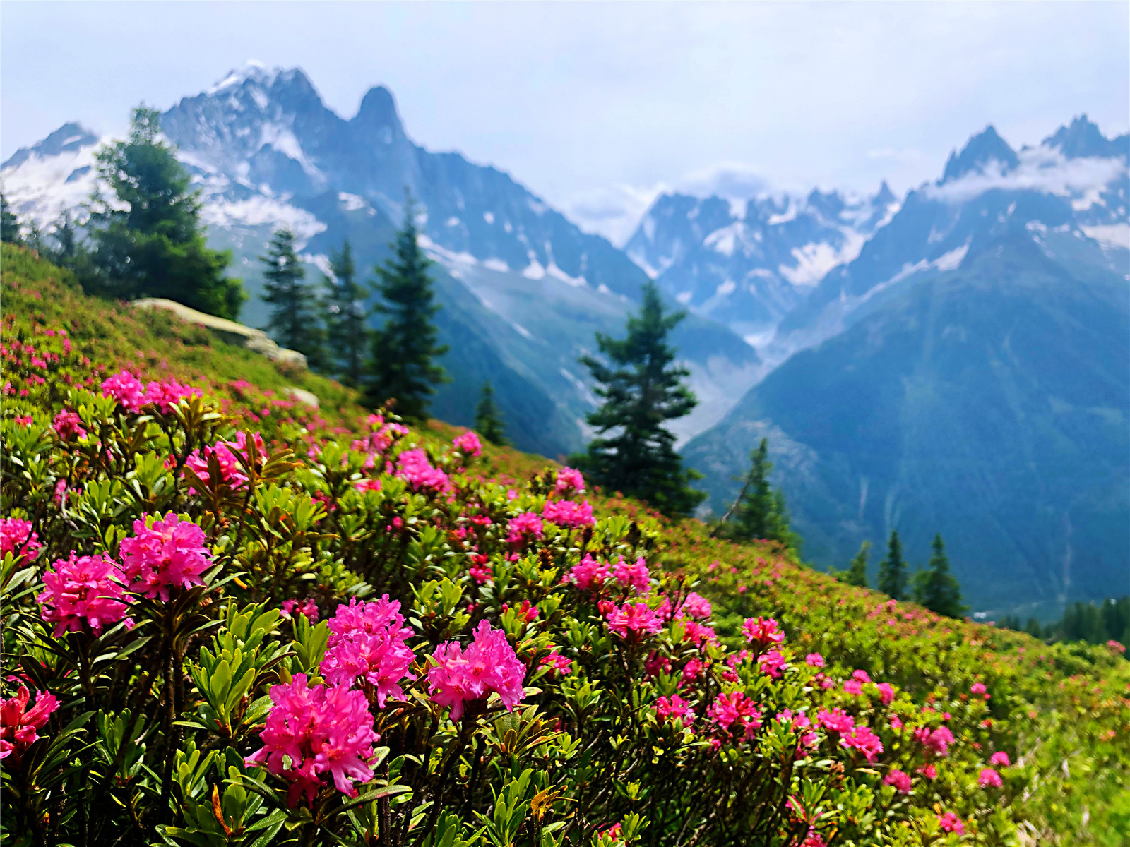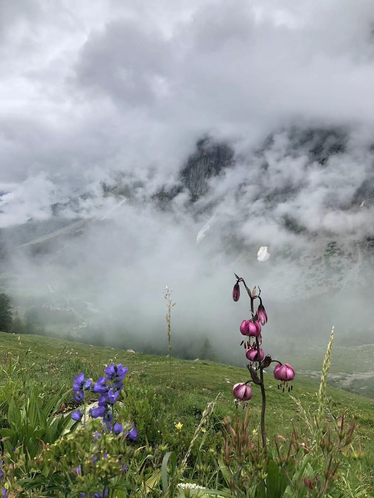 勃朗峰的空间植被分布最为精彩。亚高山一带,云杉和落叶松为主的针叶林,为雪峰系上了墨绿色的腰带。高山草甸铺开地毯,风铃草、红门兰、黄海葵、耧斗菜、堇菜、勿忘草、紫菀……点缀着姹紫嫣红的花斑。