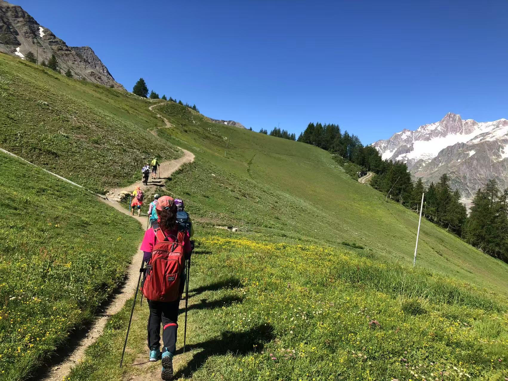 早晨起床您将会看到云雾飘渺的粉红色瑞士小教堂,随之徒步爬升,沿着灌溉水渠走过地质松软的松树林,很快抵达了一条瑞士法国必经公路,这里也曾是欧洲要塞重地,隐藏着秘密碉堡,随后继续攀升,视线也随之开阔,放眼望去瑞士小镇马蒂尼近在云边。翻过垭口后;一路下降至尚贝,抵达瑞士一片田园美景的村庄.到达Courmayeur小镇